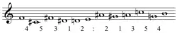 Analyses of the pitch material have fallen broadly into two camps. One, initiated by Robin Maconie,[33] holds that the piece is constructed from chromatic tetrachords; the other, founded by Dieter Schnebel[34] and continued by Jonathan Harvey,[35] maintains that the basis is actually a five-note set, consisting of that same tetrachord plus a note a minor third above (0,1,2,3,6), and ordered as a series: A, B, D, A♭, B♭, in a "succession of 5 proportions [that] runs subcutaneously through the whole piece".[34] In a passing reference to this piece, the Dutch composer Ton de Leeuw presents these same five notes in ascending scale order, which he describes as "rudiments of the 12-note series", but does not explain whether his diagram is to be understood as an ordered row or an unordered collection.[18] This same set, treated as unordered, has been taken as a starting point for a lengthy analysis by David Lewin,[36] while Christoph von Blumröder has published one nearly as long favouring Maconie's view.[37] One reviewer has judged Blumröder's analysis as a conclusive demonstration that the tetrachord is in fact the compositional basis, while conceding that Harvey and Lewin's view remains a valid construal of the piece viewed as a finished product.[38]