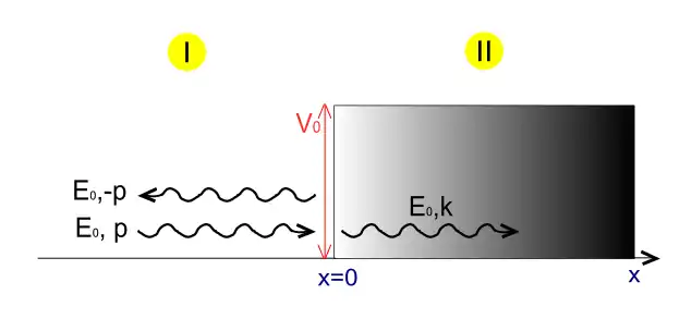Assuming the particle is propagating from the left, we obtain two solutions — one before the step, in region (1) and one under the potential, in region (2):