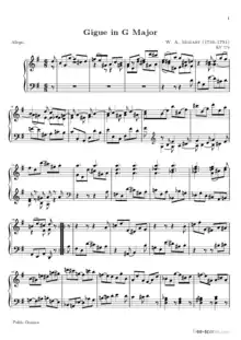 Kleine Gigue in G major, K. 574, is a composition for solo piano by Wolfgang Amadeus Mozart during his stay in Leipzig. It is dated 16 May 1789, the day before he left Leipzig. It was directly written into the notebook of Leipzig court organist Carl Immanuel Engel. It is often cited as a tribute by Mozart to J. S. Bach, although many scholars have likened it to Handel's Gigue from the Suite No. 8 in F minor, HWV 433.[1] In fact, the subject of the gigue bears a marked similarity to the subject of J. S. Bach's B minor fugue no. 24 from Book 1 of Das Wohltemperierte Klavier. Mozart has changed the tempo from Largo to Allegro deciso and the time signature from common time to 6