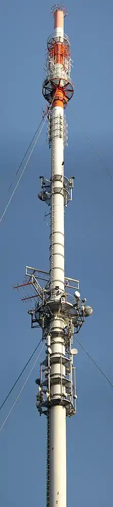 Since 1994, the transmitter uses as a transmission tower a 126.4 metres (415 feet) high guyed steel tube mast. The mast is guyed at 57 and 101.6 metres (187 and 333 feet) above ground. This mast replaced the old radio mast from the 1960s which was also used for transmissions in the medium wave range until 1993.