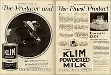 - ↑ Advertiser (June 5, 1920). "Try a KLIM SHAKE at the Soda Fountain" (JPEG). The Saturday Evening Post. Retrieved July 13, 2009.