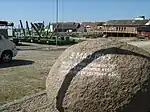 On 5 May 1945, the day Denmark was liberated from German occupation during World War II, a barge with 370 starving prisoners from the Stutthof concentration camp near Danzig (now Gdansk) arrived in Klintholm Havn. Those in control of the concentration camp had forced the prisoners onto the barge and allowed them to drift across the Baltic Sea. A German tug finally brought the barge into the harbour. The local inhabitants managed to save 351 of the prisoners, after the remaining 19 died of disease during the next few days. A memorial stone now stands on the shore of Klinthom Havn at the point where the barge came ashore. It was erected on 5 May 1995, commemorating the 50th anniversary of the event.[2][3]