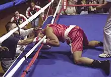 A knockdown occurs when a fighter touches the floor of the ring with any part of the body other than the feet following a hit, but is able to rise back up and continue fighting. The term is also used if the fighter is hanging on to the ropes, caught between the ropes, or is hanging over the ropes and is unable to fall to the floor and cannot protect himself. A knockdown triggers a count by the referee (normally to 10); if the fighter fails the count, then the fight is ended as a KO.[6]
