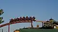 Motorcycle Chase, modernized steeplechase rollercoaster built in 1976 by Arrow Development, featured single motorbike-themed vehicles racing side-by-side, each on one of four parallel tracks, launched together.[25] One or two riders straddled each "Indian motorcycle" attraction vehicle. The tubular steel monorail track closely followed dips and bumps in "the road" and tilted to lean riders about the curves. Gasoline Alley, an electric steel-guide rail car ride below, was built together and intimately intertwined, which enhanced ride-to-ride interaction thrill value.[28] Rider safety concerns of the high center of gravity coupled with the method of rider restraints caused it to be rethemed Wacky Soap Box Racers with vehicles themed to look like soap box racers, each seating two riders, strapped in low (nearly straddling the track), surrounded by the close-fitting car sides, and the dips and bumps of the track were straightened flat in 1980. Motorcycle Chase/Wacky Soap Box Racers was removed in 1996 for a dueling loop coaster Windjammer Surf Racers and now Xcelerator, a vertical launch coaster, takes its place.