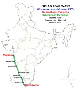 The 12202 / 01 Kochuveli Lokmanya Tilak Terminus Garib Rath Express runs from Kochuveli, Kollam Junction, Kayamkulam Jn, Chengannur, Tiruvalla, Kottayam, Ernakulam Town, Thrissur, Shoranur Junction, Kozhikode,Tirur, Kannur, Mangalore Junction, Udupi, Karwar, Madgaon, Ratngiri, Panvel, Thane to Lokmanya Tilak Terminus.