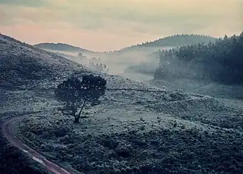 From 1948 through the 1960s the Tamil Nadu Forest Department planted large areas of indigenous grasslands along the road with black wattle for producing tanning agents for use in the leather industry.[30] blue gum (eucalyptus) and Mexican weeping pine were planted in order to provide a reliable alternative firewood supply to protect the native shola forests from cutting for firewood. The 1973 vegetation map shows these imported tree species already taking over the grasslands around the road.[31] A detailed dynamic map of 2002 vegetation shows distribution of various plantation species that have replaced most of the grasslands and native evergreen forests.[32] Another 2002 map of Palni Hills, showing distribution of wattle plantations, also shows wattle dominating the route of the Kodaikanal Munnar Road.[33] Exotic forests now cover over 80% of the area which was previously covered by Grasslands.[34] These non-native species now dominate thousands of acres once dominated by native grasses.[35]