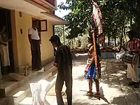Later, the remaining two sisters were said to have quarreled after witnessing the ritual of an animal sacrifice. The younger became engrossed in the ritual and settled in Kodungallur where blood sacrifices are common, leaving the elder to live in Kodikkunnu. The two sisters' dislike for the younger resulted in the closing of their temple doors in the direction facing towards Kodungallur, leading to the absence of a southern entrance at the Kanakkarkavu and Kodikkunnu Temples.[1]