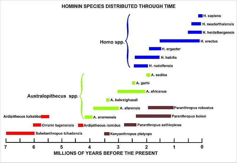Thus the fossil record of an evolutionary progression typically consists of species that suddenly appear, and ultimately disappear hundreds of thousands or millions of years later, without any change in external appearance.[33][35][48][51] Graphically, these fossil species are represented by horizontal lines, whose lengths depict how long each of them existed. The horizontality of the lines illustrates the unchanging appearance of each of the fossil species depicted on the graph. During each species' existence new species appear at random intervals, each also lasting many hundreds of thousands of years before disappearing without a change in appearance. The degree of relatedness and the lines of descent of these concurrent species is generally impossible to determine. This is illustrated in the following diagram depicting the evolution of modern humans from the time that the hominins separated from the line that led to the evolution of our closest living primate relatives, the chimpanzees.[51]