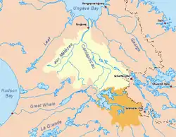 Drainage basin of the Koksoak River in yellow. Diverted basin of the Caniapiscau River in orange.