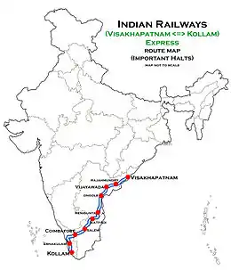 Kollam Junction → Sasthamkotta → Karunagappally → Kayamkulam → Mavelikara → Chengannur → Tiruvalla → Changanassery → Kottayam → Ernakulam Town → Aluva → Thrissur → Palakkad Junction → Coimbatore Junction → Tiruppur → Erode Junction → Salem Junction → Jolarpettai Junction → Katpadi Junction → Renigunta Junction → Gudur Junction → Nellore → Singarayakonda → Ongole → Bapatla → Tenali Junction → Vijayawada Junction → Eluru → Rajahmundry → Samalkot → Elamanchili → Duvvada → Visakhapatnam Junction[6]