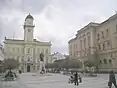 - Statue of György Klapka and the Town Hall – Today's square was created at a place of a small lake, which was formerly protecting by the walls of the medieval city. A marketplace was created there later. On the north side of it, at the end of the 17th century, there was a town hall for council meetings. In 1725 it was rebuilt. After major damage caused by the earthquake in 1763, it was restored in 1766 and supplemented in the following year by a fire guard tower. After a fire in 1848, the building was renovated again, but it was necessary to enlarge it, so in 1875 it was updated by a new watchtower, creating a town hall in the way we know it today.