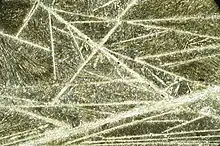 Harrisite texture, first described from intrusive rocks (not komatiites) at Harris Bay on the island of Rùm in Scotland, is formed by nucleation of crystals on the floor of a magma chamber.[14][15] Harrisites are known to form megacrystal aggregates of pyroxene and olivine up to 1 metre in length.[16] Harrisite texture is found in some very thick lava flows of komatiite, for example in the Norseman-Wiluna Greenstone Belt of Western Australia, in which crystallization of cumulates has occurred.[17]