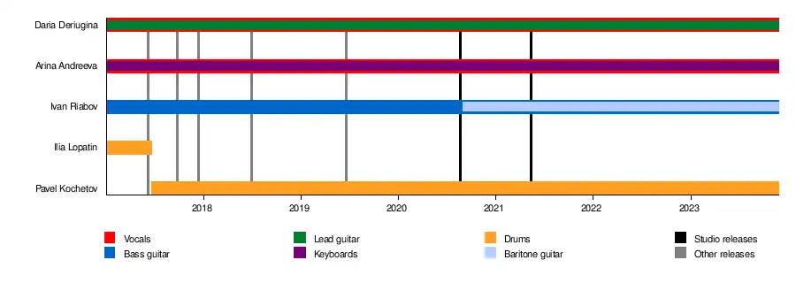 Right after debut live performance, Ilia Lopatin quit the band and emigrated to Poland, being immediately replaced with Pavel Kochetov, a drummer from Voronezh. Together with Pavel, the band signed to the independent recording label Peter Explorer and released another two extended records, Kassa Svobody (Russian: Касса свободы, lit. 'POS of Freedom') and 90210[3][4] until the end of 2017.