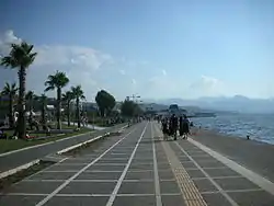 Konak is a municipality and district of İzmir Province, Turkey.[2] Its area is 24 km2,[3] and its population is 332,277 (2022).[1] It is the most densely populated of the thirty districts of İzmir, and has historically acted as the administrative and economic core of the city. Situated in an area that roughly corresponds to the geographic center of İzmir, Konak extends for 11.4 kilometres (7 miles) along the southern coastline of the Gulf of İzmir. Konak district area neighbors the district areas of Bornova to the east, Balçova to the west and Buca and Karabağlar to the south. Konak center is connected to other districts of İzmir and beyond by a dense network of roads and railroads, as well as by a subway line currently being largely extended and by ferry services to Karşıyaka. Konak is a very active hub of industry, trade, commerce and services, with the number of companies exceeding sixty thousand and its exports nearing two billion US dollars in 2006.