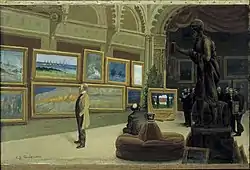 The Opponents, who had already agreed at the beginning of the year to join together in an association, formed Konstnärsförbundet at a meeting on 18 August in Hotell Christiania in Gothenburg.[6] Their aim was "to oppose all antiquities which may be injurious, and to promote all reforms which may be considered beneficial to our domestic art and art industry".[7] One of the most pressing tasks was the organization of annual exhibitions, and as early as 8 October the first exhibition bearing the name of Konstnärsförbundet was opened in Stockholm. It included 150 works by 59 exhibitors.
