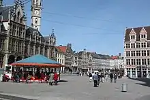 The Korenmarkt (Dutch pronunciation: [ˈkoːrəmɑr(ə)kt]; "Wheat Market") is a city square in the historic centre of Ghent, East Flanders, Belgium. Located between the Leie river and St. Nicholas' Church, it is one of the city's most important and famous tourist locations. The square is surrounded with several historic buildings, which today house bars, restaurants and terraces.[1] It is a pivotal location of the annual Gentse Feesten cultural festival.