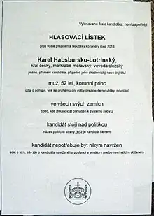 - ↑ "Plzeňan hlasoval pro dědice Habsburků, lístek si vyrobil sám". Mladá fronta DNES. 26 January 2013. Retrieved 31 July 2019.