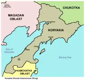 Koryak Okrug (Russian: Коря́кский о́круг, romanized: Korjakskij okrug; Koryak: Чав’чываокруг, Cav’cәvaokrug), or Koryakia (Russian: Корякия, romanized: Korjakija), is an administrative division of Kamchatka Krai, Russia.[2] It was a federal subject of Russia (an autonomous okrug of Kamchatka Oblast) from 1931[3] until July 1, 2007, when it merged with Kamchatka Oblast. Prior to the merger, it was called Koryak Autonomous Okrug (Коря́кский автоно́мный о́круг). Its administrative center is the urban locality (an urban-type settlement) of Palana. Population: 18,759 (2010 Census);[1] 25,157 (2002 Census);[4] 39,363 (1989 Census).[5]