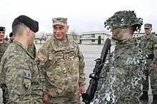 Maj. General Benjamin Corell of the Iowa National Guard inspecting a Kosovo Security Force soldier's equipment. The Iowa National Guard supports FSK in its transformation into the Kosovo Armed Forces.