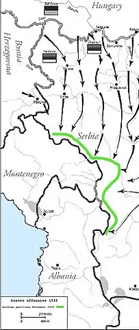 As the Germans and their allies advanced, the Serbians retreated. Although the loss of Niš, Kragujevac, Kruševac, and Kraljevo had cost the Serbians a tremendous quantity of equipment and had made a retreat inevitable, the Serbian army retained its organizational integrity as its rearguards managed to hold off the oncoming forces of the Central powers.[16] The Serbian armies reached Priština and Kosovo ahead of their pursuers. The Serbians had also taken a large number of Austro-Hungarian prisoners with them, and there was also a great many civilian refugees.[17] The Serbians had two courses open to them, namely fight or retreat, buoyed by the recent successful counterattack against the Bulgarians at Leskovac, making a final stand on the Field of Blackbirds also resonated with Serbians from a historical and national standpoint[lower-alpha 2] but a retreat to Prizren and from there across the mountains to the Adriatic coast where the army could rest and refit was the chosen course of action. Putnik gave the order to retreat on 22 November.[17]