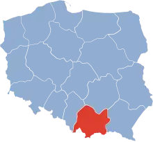 The Kraków Voivodeship[lower-alpha 1] was a voivodeship (province) with capital in Kraków, that was located in the southern Lesser Poland. It existed from 1945 to 1975. Until 19 February 1947, it was part of the Republic of Poland, which then was replaced by the Polish People's Republic. It was established on 28 June 1945, from the occupied territories of the Kraków District, General Government, and the Province of Upper Silesia, Germany.[1] In 1957, the city of Kraków separated from the voivodeship, forming a separate administrative division. It ceased to exist on 31 May 1975, when it was partitioned into then-established Kraków Metropolitan, Nowy Sącz, Tarnów, Biała, Katowice, and Kielce Voivodeships.[2]