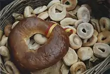The kringle (Dutch: "krakeling") that is thrown, also called mastel in Geraardsbergen, is a ring-shaped sandwich of about 10 cm diameter. The shape refers to a cult bread and symbolises the cycle of seasons or life. The party is celebrated at the end of winter, usually on the last Sunday of February.