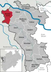 Kranenburg is a town and municipality in the district of Cleves in the state of North Rhine-Westphalia, Germany. It is located near the border with the Netherlands, 12 kilometres (7 mi) south-east of Nijmegen and 11 kilometres (7 mi) west of Cleves.