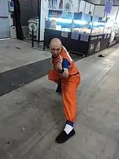 Krillin's appearance stays relatively the same for the majority of the series. He is first introduced at age 13, with a shaved head and still dressed in the yellow-and-orange clothing worn at the monastery at which he had been training. He does not possess a visible nose, and has six spots of moxibustion burns on his forehead called jieba, a reference to the practice of Shaolin monks. Toriyama once stated, seemingly humorously, that Krillin's lack of a nose is because he has a "physical idiosyncrasy" that allows him to breathe through the pores of his skin.[9] Later, he wears the orange gi uniform that is presented to both himself and Goku by Master Roshi in honor of their first martial arts competition.[10] Occasionally he is seen in casual clothes, but for the most part continues to dress for training or fighting at all times.[11] During the Frieza arc, he wears Saiyan armor provided by Vegeta,[12] but during the Cell arc he returns to wearing the orange gi, accompanied by a blue short-sleeved undershirt and boots.[13] After the defeat of Cell, Krillin stops shaving his head, and grows his black hair out, before later shaving it again during Frieza's resurrection.[14] When he settles down with his family, Krillin is shown wearing a workout outfit consisting of a red "Tacos" T-shirt and brown drawstring pants.[15]