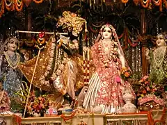 Other legends describe him as an enchanter and playful lover of the gopis (milkmaids) of Vrindavana, especially Radha. These metaphor-filled love stories are known as the Rasa lila and were romanticized in the poetry of Jayadeva, author of the Gita Govinda. They are also central to the development of the Krishna bhakti traditions worshiping Radha Krishna.[118]