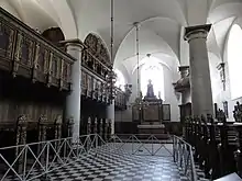 The chapel is located in the ground floor of the south wing and was inaugurated in 1582. In 1785, as the castle was being fitted for use as army barracks, the chapel was fitted out as a gymnasium and fencing hall and the furniture stored away. The chapel was refurnished with the original furniture in 1838 and reinaugurated in 1843.