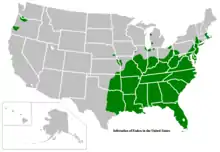 Kudzu was intentionally introduced to North America by the Soil Erosion Service and Civilian Conservation Corps in the 1930s for the purpose of controlling soil erosion in the American Southeast.[7] When kudzu was first introduced in the southeast, it was initially used as an ornamental vine to shade homes. By the early 20th century, southerners began to use kudzu for purposes other than ornamentation and so kudzu began to come closer in contact with the land which, in turn, encouraged its spread throughout the southeast.[1] In the 135 years since its introduction, kudzu has spread over three million hectares (ha) of the southern United States, and continues to "consume" the south at an estimated rate of 50,000 hectares (120,000 acres) per year, destroying power lines, buildings, and native vegetation, according to a 2006 study.[21] This claim, however, was disputed in 2015 with the United States Forest Service estimating an increase of 2,500 acres (1,000 ha; 10 km2) per year.[3] In the United States, kudzu is extensively reported in Alabama, Arkansas, Washington, D.C., Delaware, Florida, Georgia, Illinois, Indiana, Kentucky, Louisiana, Maryland, Missouri, Mississippi, North Carolina, North Dakota, New Jersey, Oregon, Ohio, Pennsylvania, South Carolina, Tennessee, Texas, Virginia, and West Virginia. Of these states, three in the southeast have the heaviest infestations: Georgia, Alabama, and Mississippi.[1]