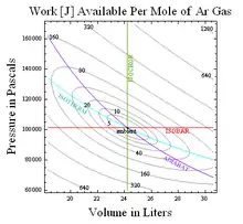 The resulting contours of constant relative entropy, shown at right for a mole of Argon at standard temperature and pressure, for example put limits on the conversion of hot to cold as in flame-powered air-conditioning or in the unpowered device to convert boiling-water to ice-water discussed here.[38] Thus relative entropy measures thermodynamic availability in bits.