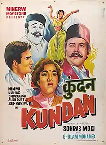 Kundan is a 1955 Indian Hindi-language social drama film produced and directed by Sohrab Modi for Minerva Movietone. The film stars Sohrab Modi, Sunil Dutt, Nimmi, Pran, Om Prakash, Kumkum, Naaz, Murad, Ulhas,Manorama.[1] The Screenplay was by Pandit Sudarshan, with dialogues by Munshi Abdul Baqui and Pandit Sudarshan. The music was composed by Ghulam Mohammed, with lyrics by Shakeel Badayuni. Nimmi's double role in the film as mother and daughter was acclaimed critically,[2] while Ulhas won a nomination in the Filmfare Award for Best Supporting Actor category.[3]
