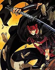 Kurogane is a rough-mannered ninja from the world of Japan, who is sent away from his world by Princess Tomoyo in order to have him discover his true strength. He is the most powerful warrior in his world, but he shows no mercy to anyone, so Tomoyo places a "curse" on him that will decrease his strength if he kills anyone. He gives up his replica of the sword, Ginryū (銀竜, lit. "Silver Dragon"), as the price to use Mokona to cross dimensions and return to his home world.[7] He quickly bonds with the group, to the point he starts tutoring Syaoran.[8] He is constantly teased by Fai, who calls him a variety of nicknames, though he also is able to tell Fai's true nature.[9] However blunt and crude Kurogane may act, he is actually quite observant and perceptive, being always acutely aware of his surroundings.
