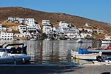 The port town is called Merichas (pop. 369), its population significantly fluctuating during the year. Before the 1970s, there were no year-round residents in recent history; a Greek fisherman named Manolas Psaras and his wife Foto were the first to live in the port year-round. Today, there is a growing year-round population, and, especially during the peak of the summer tourist season, the town becomes quite busy. Many residents of the port speak at least some English, the most popular second language. Merihas is connected to Piraeus and to Lavrion by ferry boat, and the ride takes one to four hours, depending on the speed of the ship and the weather.[4] Construction of a new mole began in 2005 to accommodate larger ferryboats and was completed in 2008. Kythnos was until recently considered to be one of the last Cycladic islands unaffected by the impact of tourism, but this is inexorably changing. Still, the island has not yet been overdeveloped, and in the more remote areas of the villages, traditional ways live on relatively unchanged.