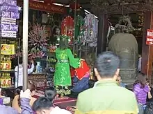 Lên đồng is commonly associated with Đạo Mẫu, Thánh Trần worship and Nội Đạo Tràng.[3] The date of lên đồng rituals are typically planned to coincide with a festival, anniversary, or the inauguration of a Mother house, although rituals may also be performed at more informal occasions. Rituals are generally held in temples, shrines or similarly sacred locations.[4] Joss paper—which may range from flowers, cakes and sweets to alcohol, cigarettes and jewelry—and, on certain occasions, even Coca-Cola cans[nb 1]—must be purchased.[2] Mediums generally also purchase a number of different costumes to be worn during the ritual. Before the main ritual takes place, mediums undergo several days of purifying rituals, involving abstention from sexual intercourse and eating meat.[2]