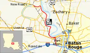 LA 415 begins at Interstate 10's exit 151 in West Baton Rouge Parish, west of Port Allen. Just north of the interchange, LA 415 begins a concurrency with LA 76. The two routes travel north as a four-lane undivided highway with a center turn lane. After LA 76 exits the concurrency, LA 415 continues north and widens to a divided highway. In the unincorporated community of Lobdell, LA 415 turns off the divided highway to continue north on a two-lane undivided road. The divided highway continues for about one-half mile (0.80 km) as LA 415 Spur and provides access to westbound U.S. Route 190 and northbound LA 1. LA 415 makes two sharp turns to pass under US 190 and LA 1 with access to eastbound US 190 and southbound LA 1 being provided via nearby roads. Just before a levee to the Mississippi River, the road comes to a T-intersection with LA 986 at its northern terminus. LA 415 makes a left onto the road paralleling the levee.[1]