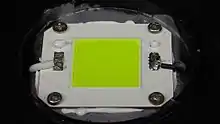 An 80W Chips on board (COB) LED module from an industrial light luminaire, thermally bonded to the heat sink