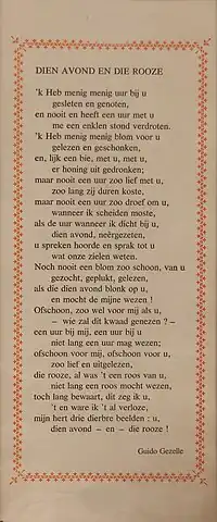 Also Guido Gezelle does not really qualify as an LGBT writer in Komrij's definition: as a Catholic priest he certainly did not write explicitly for a gay audience, nor was any of his writing strictly speaking about homosexuality. Nonetheless Dien avond en die rooze (That Evening and that Rose) is generally understood to have been a love-poem for Eugène van Oye, one of his students he had befriended.