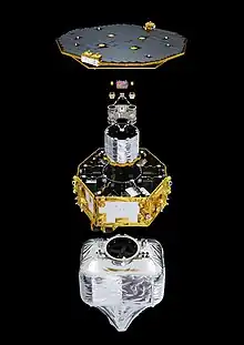 LISA Pathfinder was assembled by Airbus Defence and Space in Stevenage (UK), under contract to the European Space Agency. It carried a European "LISA Technology Package" comprising inertial sensors, interferometer and associated instrumentation as well as two drag-free control systems: a European one using cold gas micro-thrusters (similar to those used on Gaia), and a US-built "Disturbance Reduction System" using the European sensors and an electric propulsion system that uses ionised droplets of a colloid accelerated in an electric field.[14] The colloid thruster (or "electrospray thruster") system was built by Busek and delivered to JPL for integration with the spacecraft.[15]