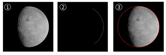 With this technique each picture is processed to find the edges of the moon. Then, an ellipse is fitted to reconstruct the location of full lunar limb in the image. The fitted ellipse is the bi-dimensional projection of the three-dimensional Moon ellipsoid onto the image plane. Since the characteristics of the camera and the dimensions of the Moon ellipsoid are known, the ellipse points can be used as a state measurements in a Kalman filter.[16]