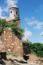 The Santa Rosa de la Eminencia castle was built in 1682. Due to its prominent location on a hill, it acted as an observatory to watch for any invading forces approaching from the north, south, or east. A tunnel (a kilometer long, dug during the original construction) from the fort connected it to the governor's house, the church, and the Convent of San Francisco. The fort guarded the eastern approach to the capital and was one of three forts that secured the island's strategic location to fend off the English, French, Dutch and other colonizers.[3][8][11] It was where Luisa Caceres de Arismendi, wife of the leading freedom fighter Juan Bautista Arismendi against Spanish imperialism, was imprisoned after capture by the Spanish on 27 September 1816. She had been taken prisoner three days earlier, on the day before her 17th birthday. She became a local heroine; in the prison cell of the fort, her first son was born and died prematurely due to lack of medical attention. She was imprisoned as her husband had escaped to the forests of Cerro El Copey and by capturing her they hoped that they could make the freedom fighter to surrender but the plan failed. After the death of the baby she was moved to Spain from where she escaped. She eventually joined her husband with whom she begot 11 children and died at the age of 65. After her death she had the honour of becoming one of two women buried in the National Pantheon in Caracas. The cell where she was incarcerated in the castle has been preserved in its original form. An inscription at the entrance to the cell reads "Luisa Caceres de Arismendi for her virtue valour and martyrdom for her husband and country as prisoner in this jail when she was 16 years of age." The fort has exhibits of weapons of war, paintings of Simon Bolivar, knights in armor, and also iron balls which were tied to the legs of prisoners. Behind the kitchen there is a bottle dungeon whose entrance is through a hole in the roof.[2][3][11] The fort provides an excellent view of the sea and Cerro Matasiete. It had a moat and a draw bridge which no longer exist.[3] The map on display in the museum is reported to be the best in the world.