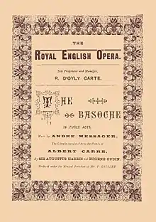 The opera was presented in English as The Basoche in London in 1891, in an English translation by Augustus Harris (dialogue) and Eugène Oudin (lyrics) at Richard D'Oyly Carte's Royal English Opera House. Carré and Messager were present at the opening night and took curtain calls along with the conductor, François Cellier. The London cast was:[14][15][n 2]