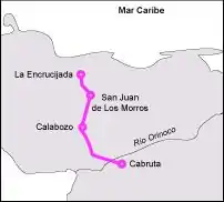 With the revival of rail in Venezuela, La Encrucijada is planned to be the site of an important rail junction, linking a route to the Caribbean port of Puerto Cabello (which roughly follows the routes of defunct 19th century railway lines) with new routes into the interior of Venezuela, such as a line south across the Llanos.[1] However, while some construction has taken place with Italian and Chinese involvement, it appears to have come to a halt. In 2016 it was reported that investments in the Venezuelan rail system had become risky.[2]