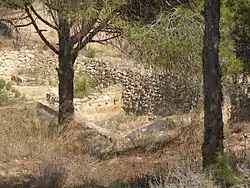 Archaeological work on a section of wall has revealed 60 m (200 ft) of defensive fortifications. The wall, built from medium-sized stones of soft sandstone and calcarenite limestone, was between 4 and 5 m (13–16 ft), and may have been over 7 metres (23 ft) wide at its base. An advanced architectural method was employed to construct it, with buttresses hígher than the brick being placed at regular points to isolate sections of the wall and prevent movement, such as that caused by an earthquake, from being transmitted along its entire length and making it unstable. Among the material culture found at La Fonteta is a large repertoire of Phoenician typological pottery: amphorae, plates, decorated cups, and a variety of red slipware and burnished pottery including rimmed plates, bowls, oenochoes, lamps, and tripods. Archaic Greek pottery, and ritual objects such as decorated ostrich eggs, ivory,[1] and scarabs, etc., appear as well.[2]