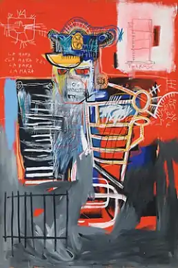 La Hara is one of the few works of white men painted by Basquiat. The artwork depicts a menacing white skeletal figure wearing a peaked cap against a red background. Basquiat incorporates vivid colors and diagrams throughout the painting. The word "LA HARA" is written multiple times on the left side of the figure. Drawing from his Puerto Rican culture, la hara derives from the Nuyorican term la jara, slang for police, which is a play on the Irish surname O'Hara.[3] O'Hara was considered a common surname for New York police officers during the 1940s and 1950s.[4] The bottom of the painting is gray with steel jail cell bars.