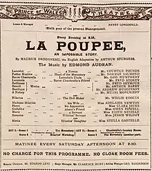 The opera opened at the Théâtre de la Gaîté, Paris, on 21 October 1896.[2] Along with Miss Helyett (1890), La poupée was one of Audran's late successes. It then played at the Prince of Wales Theatre in London, opening on 24 February 1897, with an English libretto in two acts by Arthur Sturgess, running for a very successful 576 performances. It starred Courtice Pounds and Willie Edouin, and Edna May later played in the piece.[2]