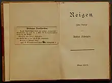 Schnitzler's play was not publicly performed until 23 December 1920 in Berlin and 1 February 1921 in Vienna. (An unauthorized production was staged earlier in Budapest in 1912.)[3] The play elicited violent critical and popular reactions. Schnitzler suffered moralistic and personal attacks that became virulently antisemitic; he was attacked as a Jewish pornographer and the outcry came to be known as the "Reigen scandal."[4] Despite a 1921 Berlin court verdict that dismissed the charges of immorality, Schnitzler withdrew La Ronde himself from public production in German-speaking countries.[5]