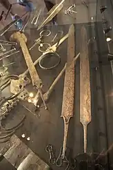 All in all, over 2500 objects, mainly made from metal, have been excavated in La Tène. Weapons predominate, there being 166 swords (most without traces of wear), 270 lanceheads, and 22 shield bosses, along with 385 brooches, tools, and parts of chariots. Numerous human and animal bones were found as well. The site was used from the 3rd century, with a peak of activity around 200 BCE and abandonment by about 60 BCE.[28] Interpretations of the site vary. Some scholars believe the bridge was destroyed by high water, while others see it as a place of sacrifice after a successful battle (there are almost no female ornaments).