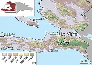 La Visite National Park (French: Parc National La Visite) is one of the two largest national parks of the Republic of Haiti. La Visite is a part of the Massif de la Selle mountain range. Its highest peak is 2275 meters in elevation. The park covers approximately 11,419 hectares of land with 1897 hectares above 2000 meters in elevation, and consists mainly of pine forest, grasslands, and some montane broadleaf forest above 1,700 m (5,600 ft) elevation.[1] The Haitian government established the La Visite National Park in 1983. The capital, Port-au-Prince, is only 22 kilometers north from the park.[2] The northern boundary of La Visite National Park is the east-west running escarpment of the Massif de la Selle.